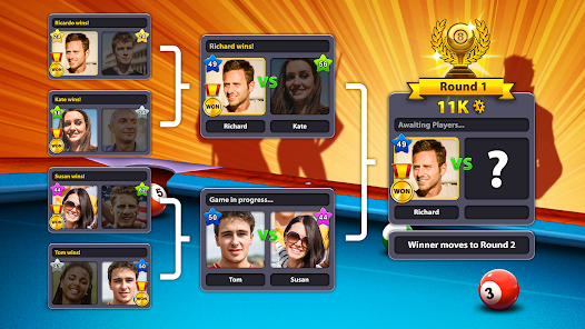 يمنحك 8 Ball Pool™ فرصة الانغماس في عالم مثير من مباريات البلياردو حيث تتدحرج الكرات بشكل مستمر على الطاولة، مما يخلق تجربة واقعية وممتعة. كل ضربة تقوم بها تحتاج إلى تركيز ودقة عالية لتحديد الزاوية وقوة التأثير، مما يجعل كل لحظة في اللعبة مليئة بالتحدي.