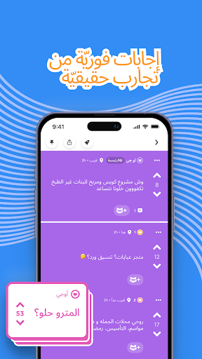 التطبيق يشجع على طرح الأسئلة وتبادل المعلومات المحلية، مثل أفضل الأماكن أو الخدمات أو الأحداث.