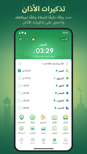 يعرض التطبيق مواقيت الصلاة اليومية بدقة حسب موقعك، مع إمكانية تشغيل صوت الأذان والتنبيهات قبل الصلاة. كما يمكنك تخصيص طريقة الحساب وضبط التنبيهات بما يناسب مدينتك أو بلدك.