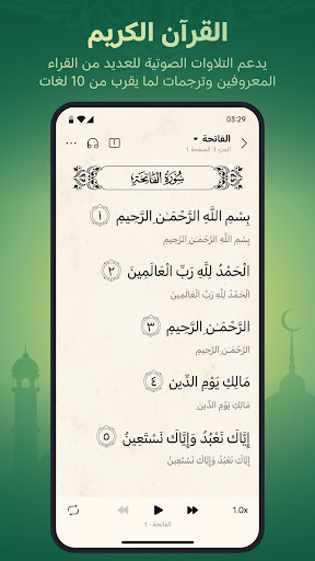 يوفّر القرآن الكريم بنص واضح مع دعم التلاوات الصوتية لعدد من القرّاء، وإمكانية تحميل الصوت للاستماع لاحقًا. كما يدعم التطبيق ترجمات متعددة لتسهيل الفهم لغير الناطقين بالعربية.